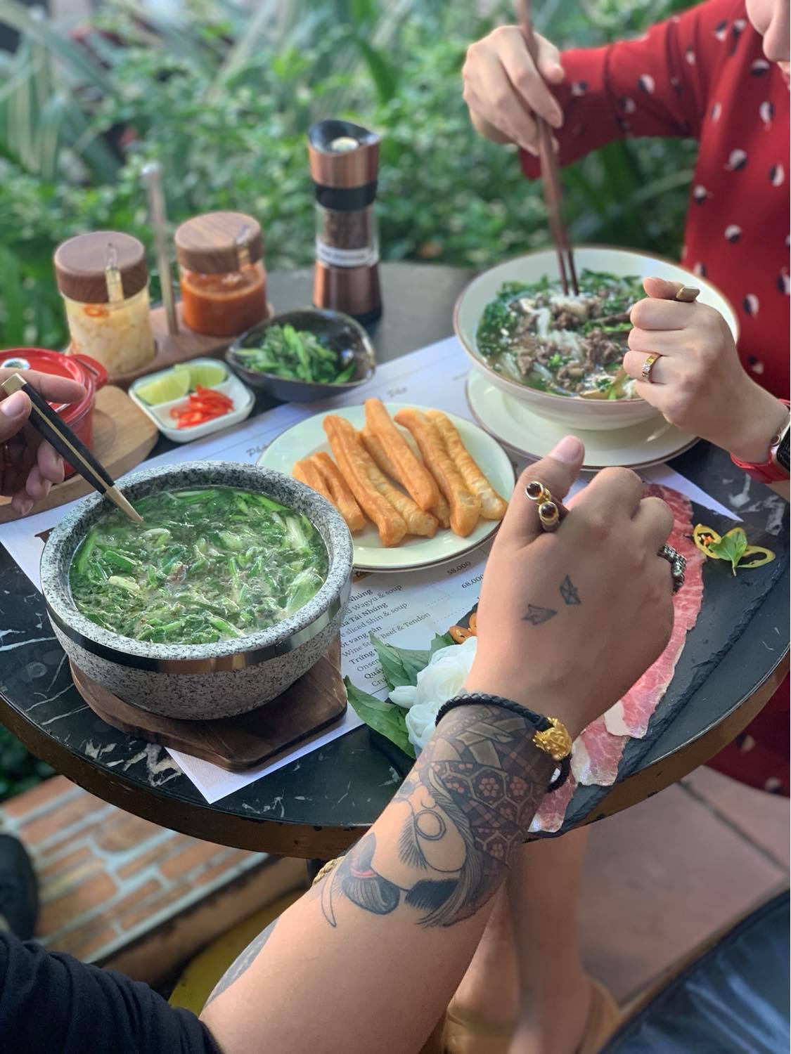 This restaurant offers a warm and peaceful atmosphere with greenery staffed by helpful restaurant workers in the signature bà ba shirt, a traditional Southern Vietnamese loose-fitting blouse.