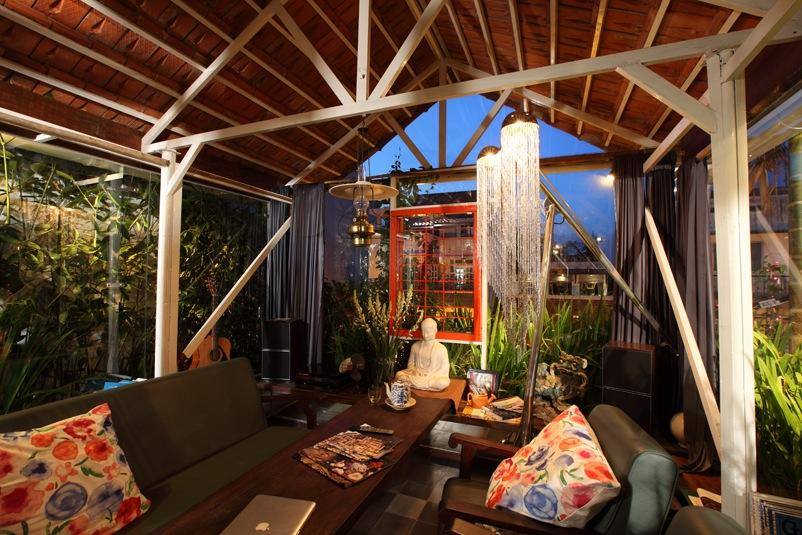Every small detail such as tables, chairs, bowls, and flower vases in the eatery are recycled and redesigned from old furniture and recovered materials giving the restaurant a unique rustic atmosphere.