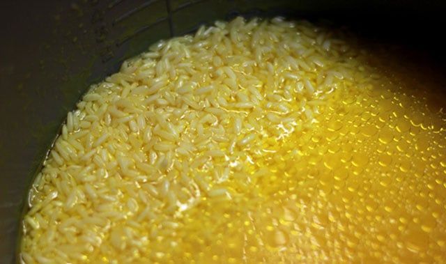 Rice used for the dish should be locally grown and newly harvested. They cook rice in the pilaf style, using sauteed garlic or onion, chicken broth, and oil. The result is savory, balanced moisture and soft and flavorful rice. People also add turmeric for the vibrant golden color and a more nutritious one.