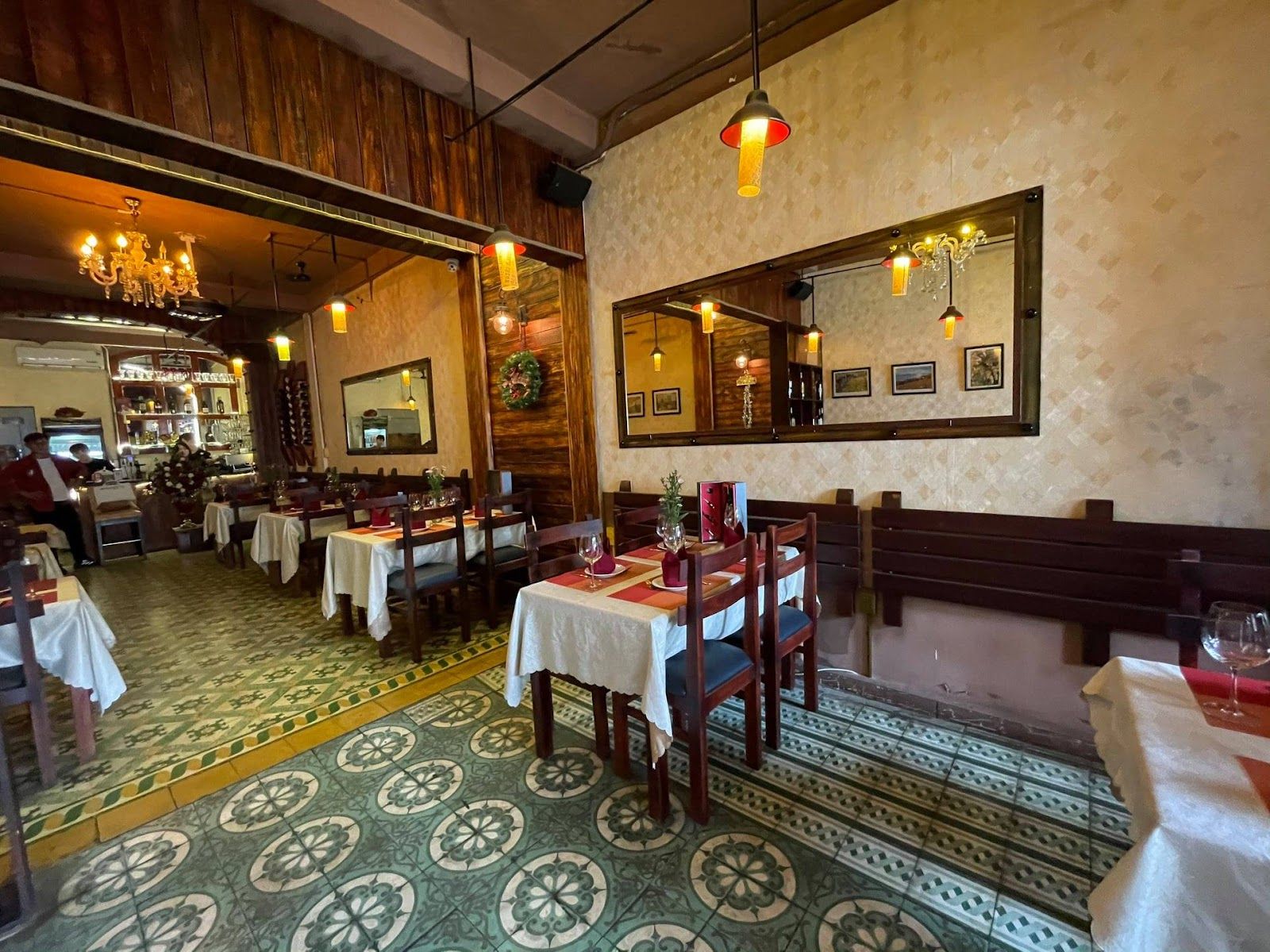 The restaurant offers a variety of special dishes from appetizers with cold meats and mixed salami, French snail salad,… Main dishes with pan-fried foie gras, Top Blade Steak beef, baked duck breast, grilled Norwegian salmon with cod roe,... The food is elaborately prepared and beautifully presented. Located on Bach Ma Street, this French restaurant has a casual and cozy look with beautiful marble floors, wooden wall panels, and yellow warm lights.