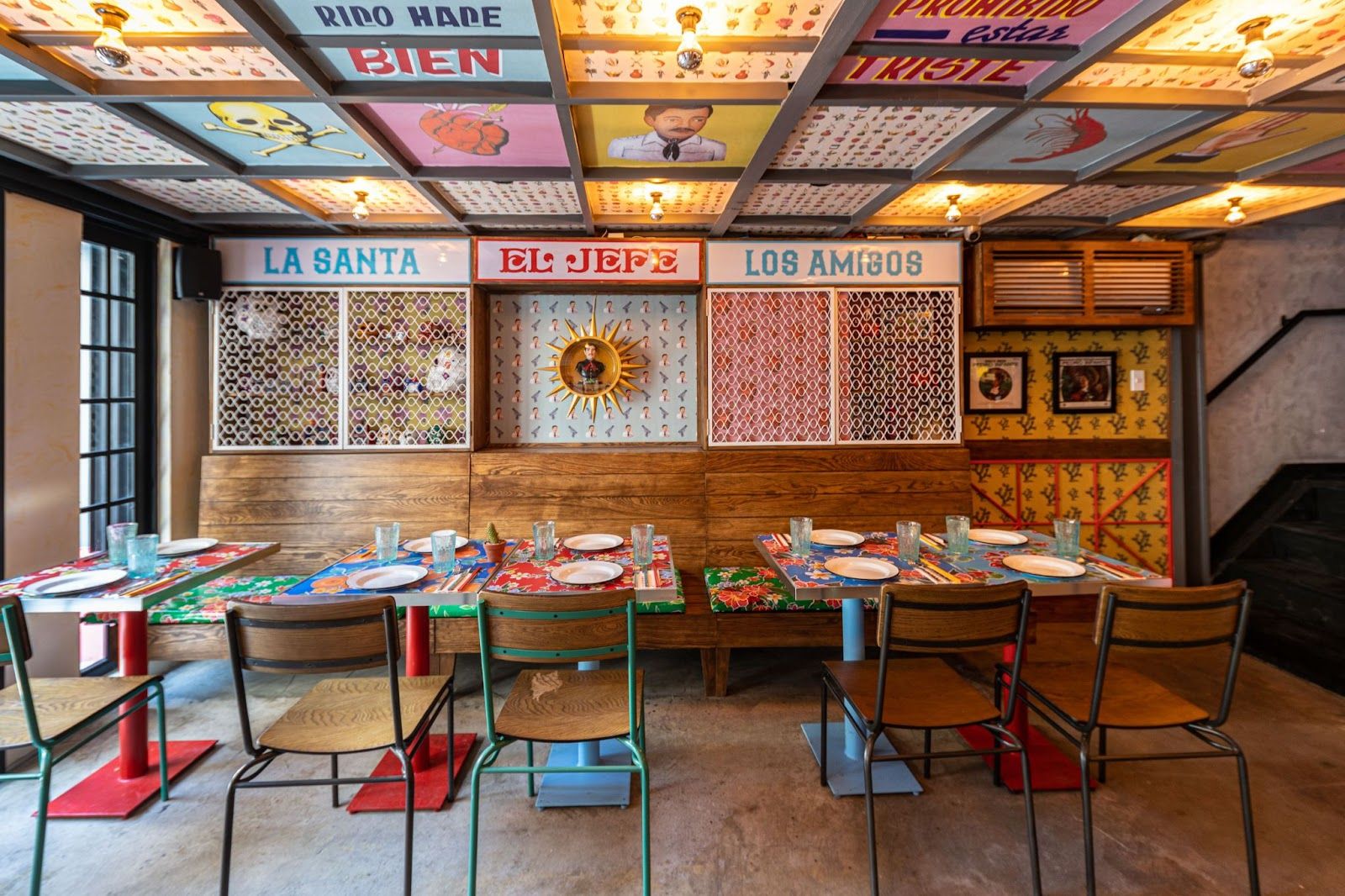The design here reflects the charms of Mexican culture all over the two floors. The decorations come directly from Mexico City's flea market and the custom wallpapers are inspired by the traditional "Loteria" card game. All to bring the visitors the Mexican festival vibes.